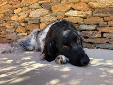 En toen waren Taeke en ik dus weer met zijn tweetjes! Taeke is echter gewoon ontspannen en gaat rustig liggen kijken waar ik ook maar ga zitten. En als er dan een hele rijd toeterende auto's voorbij komt, geeft dat ook wat om naar te kijken. Ik denk een stoet voor een bruiloft aan de vrolijke slingers te zien aan de auto's 😅