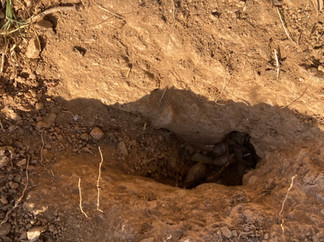 Over de steeneik gesproken....tijdens het graven van Taeke naar de muisjes spotte ik ineens een eikel die aan het ontkiemen was. Dat is leuk, want deze eikels ontkiemen niet zo makkelijk! Een paar dagen later zag ik er nog 2 en deze hadden zelfs al een klein boompje eraan! Voordat Peter de bosmaaier weer over het veld haalt, snel deze uitgegraven en in een grote pot gezet. Één van de boompjes knapte af helaas bij het eruit graven, maar de andere staat nog. Ik heb iets later deze mini boom in een potje gezet. De andere eikels zitten in de grote pot. Ik ben benieuwd!