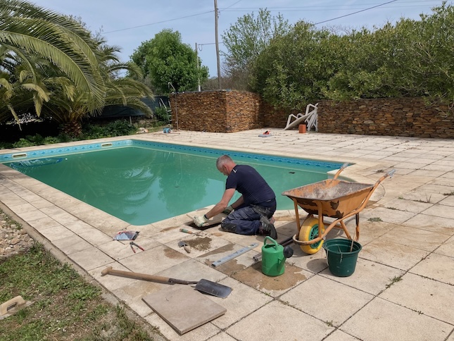 Één van de redenen dat het zeil in het water was gevallen, was omdat de tegels waar de elastieken aan verbonden waren kapot waren gegaan en los gekomen. Wat bleek; het terras om het zwembad is niet helemaal goed aangelegd. Er is op plekken geen gestabiliseerd zand neergelegd, maar gewoon los zand. Wat dus wegspoelt... Tegels die schots en scheef liggen en breken en het was helemaal niet goed gevoegd. Of het nou überhaupt niet goed gevoegd is geweest of die allemaal al meer dan versleten zijn geweest; zeg het maar. Maar dit was dus ook meteen een startklus van Peter: tegelen, voegen en dan ook alles meteen reinigen. Zowel rond het zwembad, als op en rond het overdekte terras. En zo heeft hij ook al menig voeg rond het huis vernieuwd, wat weer vochtproblemen scheelt in huis. En op het overdekte terras heeft hij inmiddels ook licht aangebracht, dus de komende zomer kunnen we daar gebruik van maken als het buiten donker wordt!