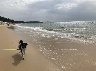 Prachtig strandje, kite surfers in de weer en aan dit strand staan vele huizen met hun tuin grenzend aan het strand. Lijkt heerlijk, maar als je denkt aan de zeespiegel stijging....mwah...haha! Maar voor nu is het heerlijk. Taeke geniet en kwispelt alleen maar. En we vinden zelfs nog heuze "beach art" 😂 Vanaf dit strand zie je in de verte ook de Dune du Pilat liggen.
