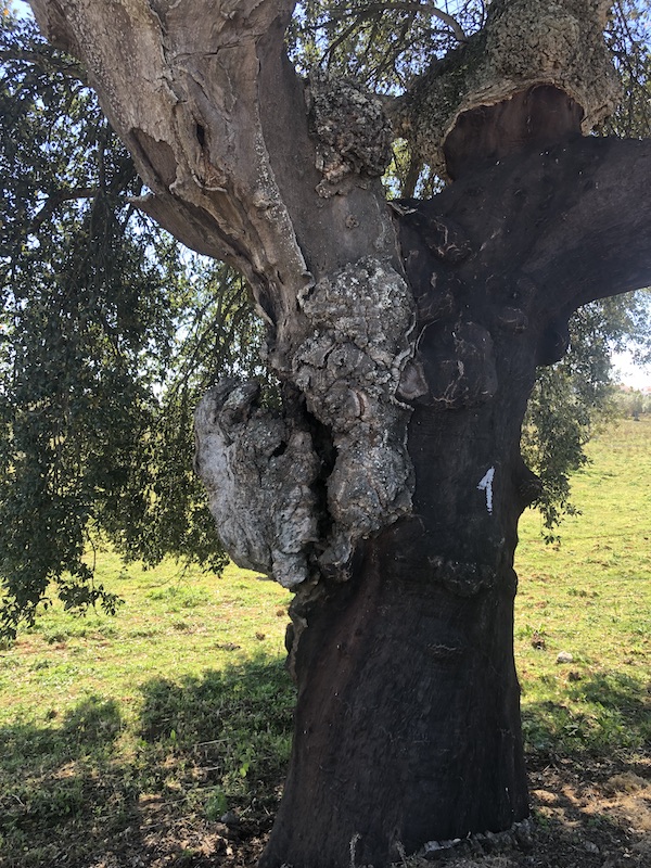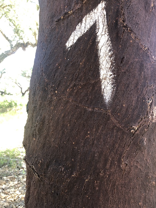 De kurklaag wordt om de 8 tot 10 jaar geoogst. Om bij te houden wanneer de laatste oogst was wordt het laatste getal van het jaar op de boom geverfd. Je kan dan meteen goed zien hoe de kurk groeit. In de volgende foto's is geoogst in 2021 en 2017: